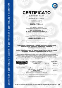 We are UNI EN ISO 9001 certified in the design, manufacture and installation of metal shelving and warehouse equipment as well as in the installation of steel metal structures.